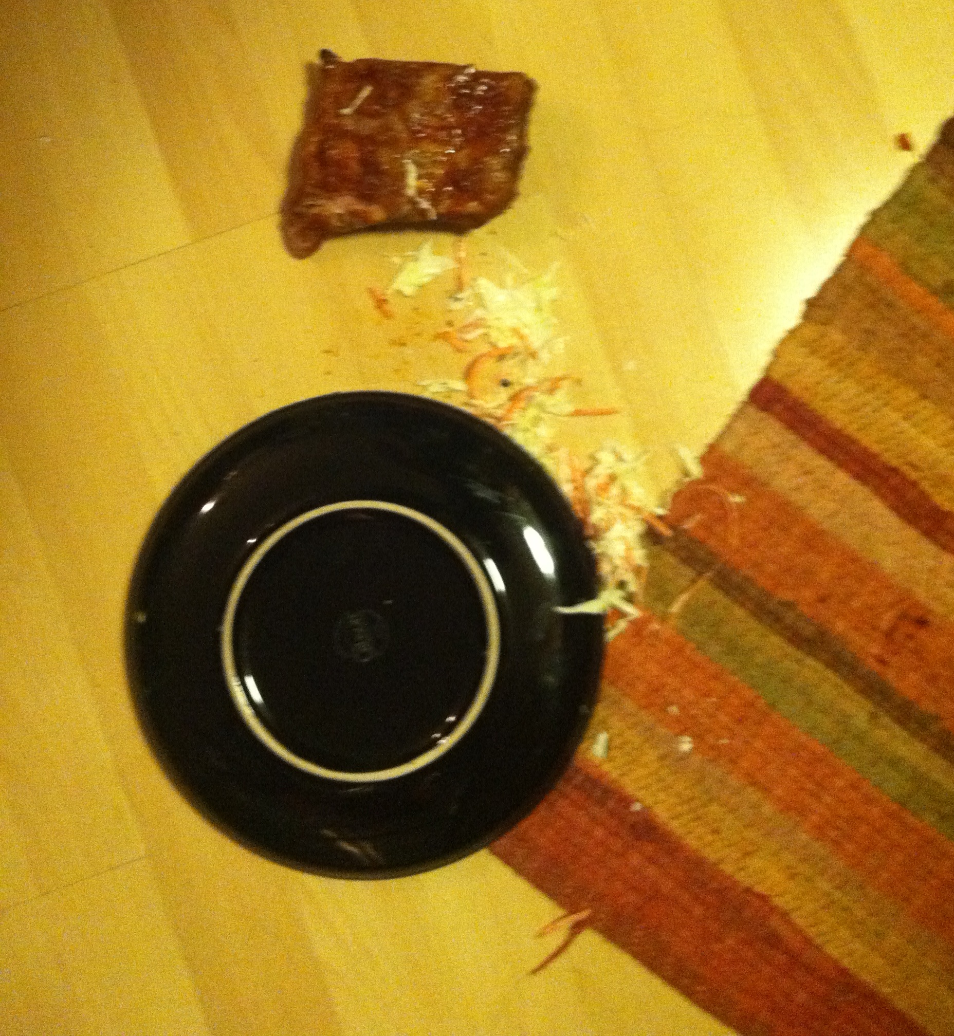 Everything tasted really good, though. And I didn’t wind up with rib sauce by my ear. Small victories! I did wind up with some on my pants, though. And I almost knocked over my wine. But the piece de resistance was when I made my delicious plate and then dropped it right on the floor. I guess some things never change. I should’ve worn my paint clothes over.