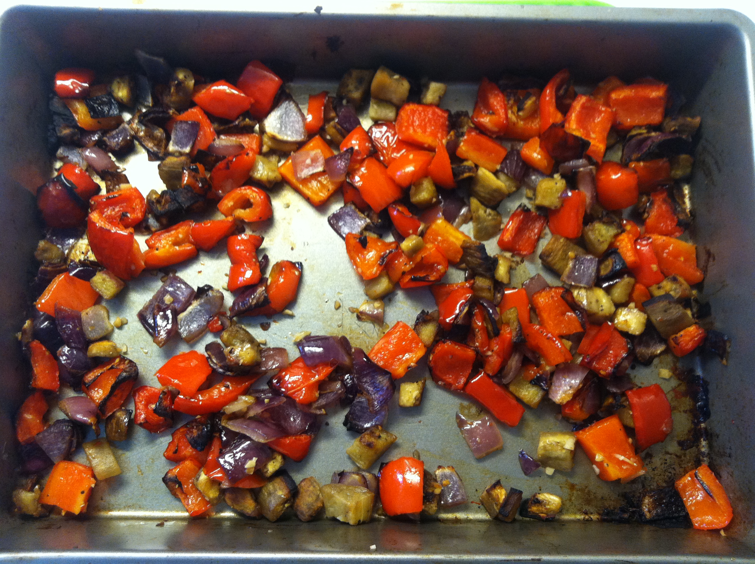 Cut the eggplant, bell pepper, and onion into 1-inch cubes. Toss them in a large bowl with the garlic, olive oil, salt, and pepper. Spread them on a baking sheet. Roast for 45 minutes, until the vegetables are lightly browned and soft, tossing once during cooking.
