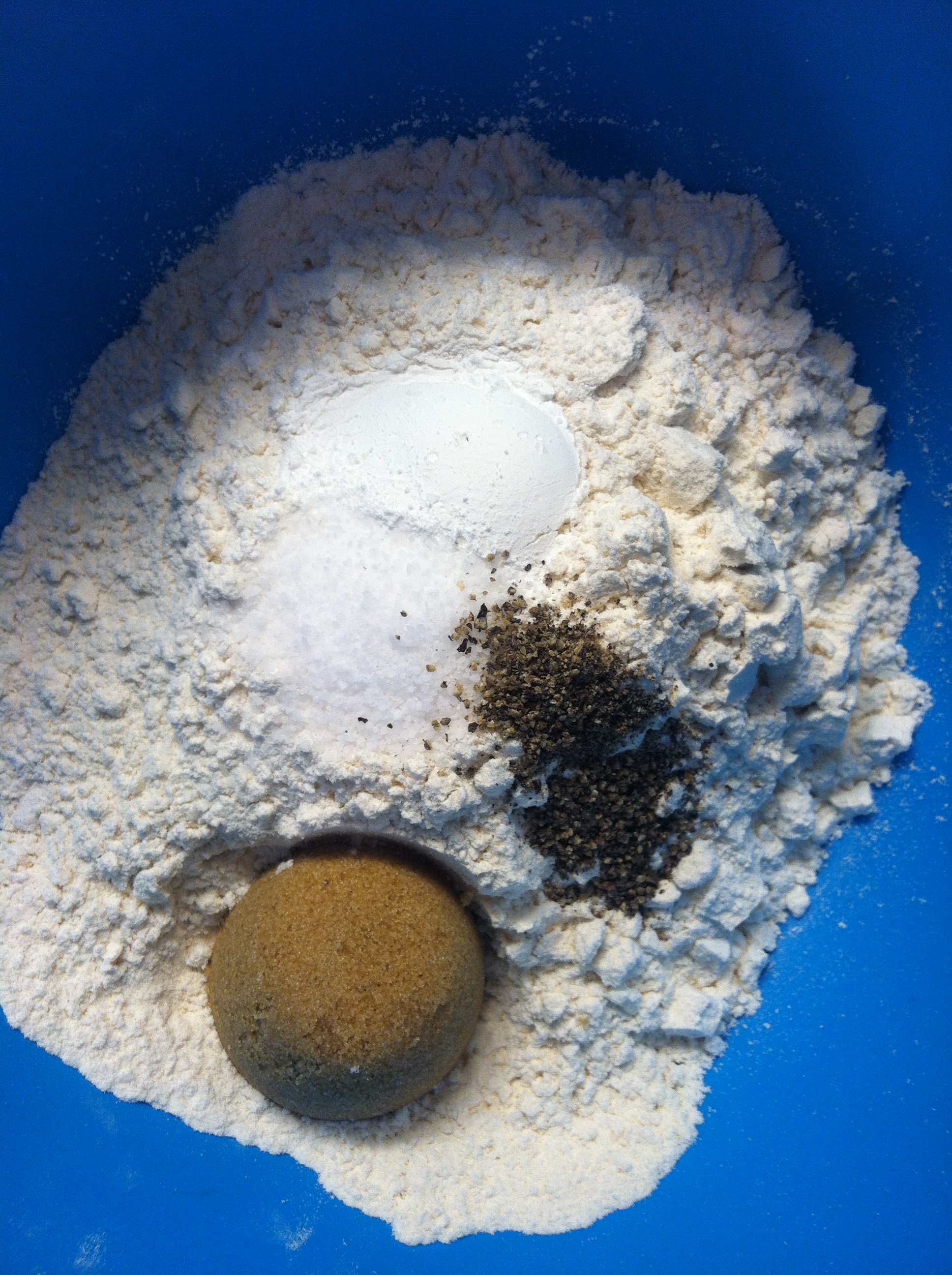 Whisk together the flour, baking powder, salt, sugar, and pepper.