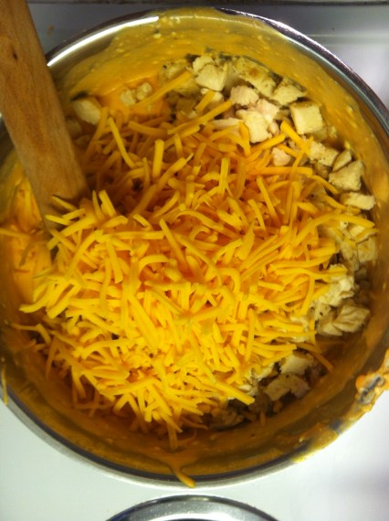 Stir in chicken and about half of the cheddar cheese. Stir until combined.