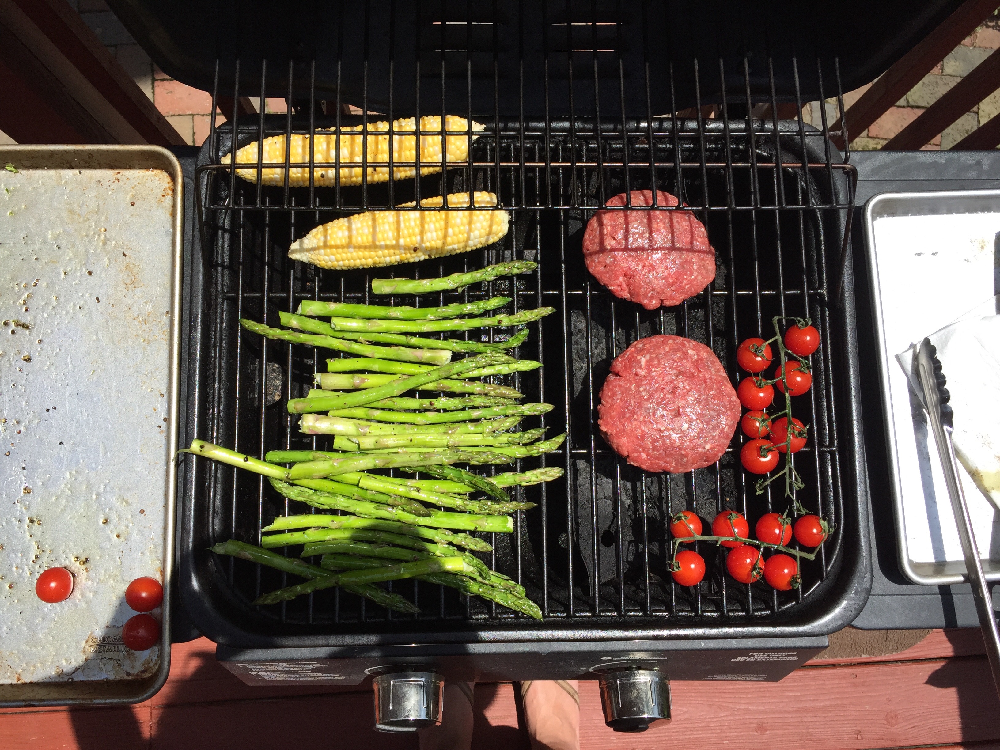 Rub corn, asparagus, and cherry tomatoes with olive oil. Sprinkle with salt and pepper. Char on the grill to your desired charification. 6-7 minutes for the corn and asparagus. 3-4 minutes for the tomatoes, until they burst. Toss with the diced onion, drizzle with olive oil, red wine vinegar, salt and pepper to taste. Eat it up.